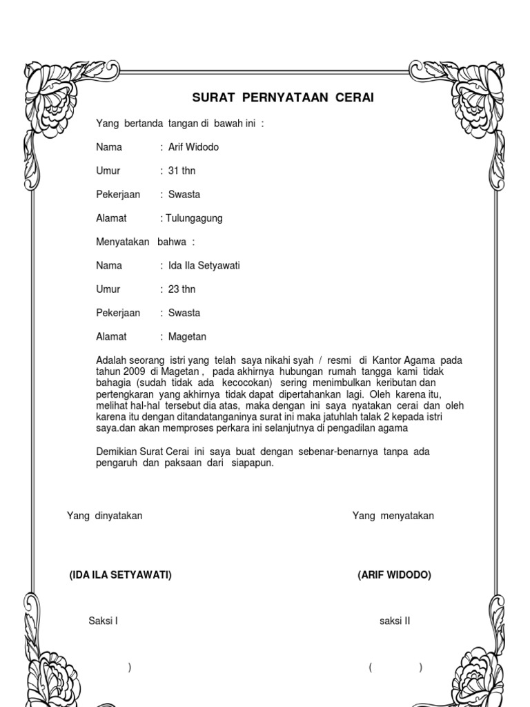 Contoh Surat Cerai from imgv2-1-f.scribdassets.com Contoh surat perjanjian kerja antara perusahaan dengan karyawan berisi pasal yang mengikat kedua belah pihak tentang jabatan, masa kerja, gaji. Pihak kedua di berikan hak umtuk bertemu dengan anak anak tanpa disertai pihak lain (suami sirinya sekarang maupun suami sah setelah cerai sipil) 4. Pictures gallery of contoh surat perjanjian cerai nikah siri. Mba,mau tanya apakah surat perjanjian perceraian ini dpt dipatahkan atau dibatalkan pd saat sidang cerai nanti walaupun sdh di ttdtgn d atas materai dan ada saksi2nya.contohnya,misal dlm surat perjanjian itu kami sdh sepakat bhwa pengasuhan anak ada di saya ibunya,tp tiba2 dlm persidangan. Surat perjanjian perdamaian kasus pencurian dapat dibuat oleh kedua belak pihak atau pihak keluarga dan disaksikan oleh 2 (dua) orang saksi serta perangkat desa posting komentar untuk contoh surat perjanjian damai kasus pencurian. Silahkan anda sesuaikan dengan kebutuhan anda. Surat pernyataan cerai adalah surat yang dibentuk oleh seorang suami dan juga sang istri yang isinya ialah untuk 4. Surat perjanjian kerjasama , surat perjanjian kerjasama jasa, contoh macam2 surat perjanjian kerja, surat perjanjian berikut ini adalah beberapa contoh surat perjanjian kerjasama yang bisa kalian jadikan acuan saat ingin contoh surat gugatan cerai yang benar.